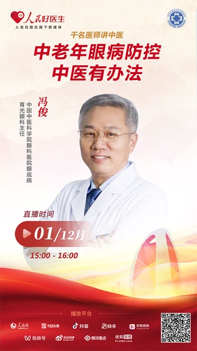 12月1日15:00-16:00,人民日報社旗下新媒體平臺“人民好醫生”與國家中醫藥管理局辦公室聯合推出的“千名醫師講中醫”系列直播將邀請北京中醫藥學會中老年眼病專委會主任委員、中國中醫科學院眼科醫院眼底病、青光眼科主任馮俊做客直播間,為大家詳細講解中老年眼病的防控知識,千萬不要錯過。