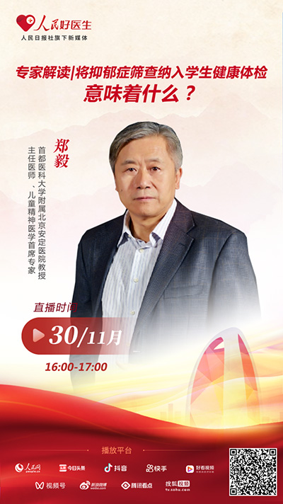 11月30日16:00,首都醫科大學附屬北京安定醫院教授、主任醫師、兒童精神醫學首席專家鄭毅將做客人民日報社旗下新媒體平臺“人民好醫生”客戶端直播間,為廣大網友進行政策權威解讀,歡迎屆時收看。