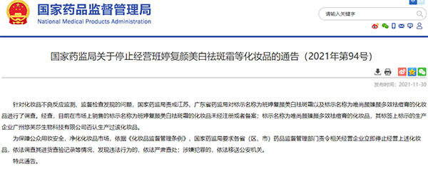 據了解,國家藥監局自2021年10月起,開展化妝品“線上凈網線下清源”專項行動,其中,“清理整治未經注冊或未備案的化妝品:未經注冊或未備案、冒用他人注冊證、已要求停止經營的化妝品”為行動的三大工作重點之一。