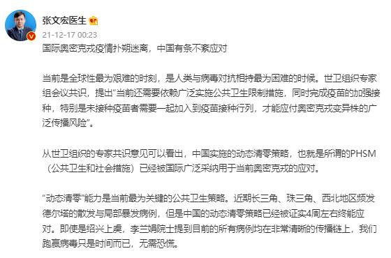 人民網(wǎng)北京12月17日電 (記者喬業(yè)瓊)12月17日凌晨,復(fù)旦大學(xué)附屬華山醫(yī)院感染科主任張文宏在其微博上表示,國際奧密克戎疫情撲朔迷離,中國有條不紊應(yīng)對(duì)。