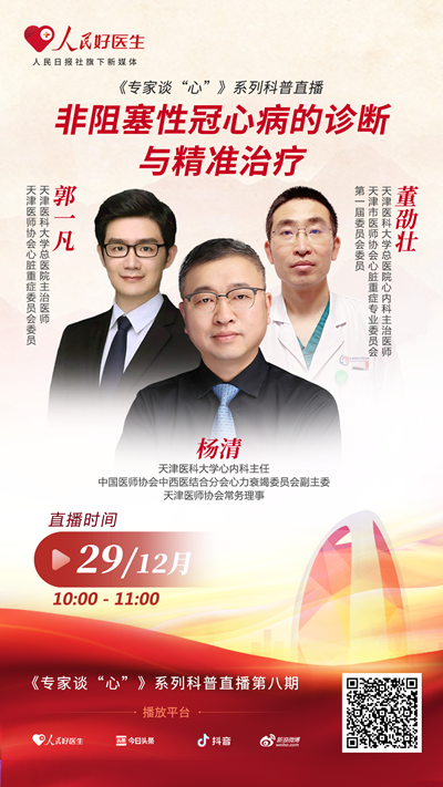 12月29日10:00-11:00,人民日報社旗下新媒體客戶端“人民好醫生”將邀請天津醫科大學心內科主任、中國醫師協會中西醫結合分會心力衰竭委員會副主委楊清,天津醫科大學總醫院心內科主治醫師、天津市醫師協會心臟重癥專業委員會第一屆委員會委員董劭壯,天津醫科大學總醫院主治醫師、天津醫師協會心臟重癥委員會委員郭一凡做客直播間,為大家帶來非阻塞性冠心病的診斷與精準治療的相關內容,歡迎大家收看。