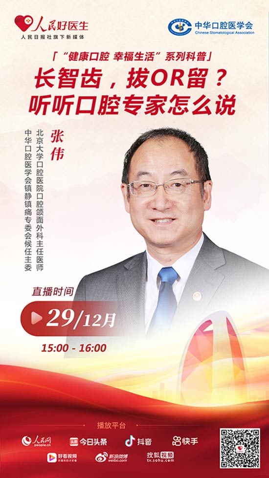長智齒了,到底拔還是不拔呢?12月29日15:00,北京大學口腔醫院口腔頜面外科主任醫師、中華口腔醫學會鎮靜鎮痛專委會候任主委張偉做客人民好醫生客戶端詳解智齒相關知識,讓我們一起來聽聽口腔專家的解答。