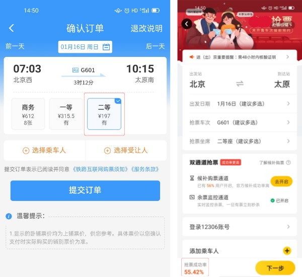 同一車次在鐵路12306可以正常購買,在某平臺上標(biāo)注的搶票成功率為55.42%。制圖:記者喬業(yè)瓊