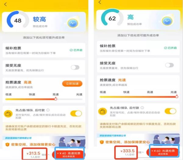 在某B平臺上選擇上海虹橋至成都站硬座搶票,同樣分了低速、快速、高速、光速四個不同檔次的搶票加速包,每增加一個檔次需要消費(fèi)者多支付20元。同時,B平臺還在訂票界面標(biāo)注了具體的搶票成功率,消費(fèi)者加速包越貴,顯示的成功率越高。如低速41%、快速44%、高速48%、光速62%。