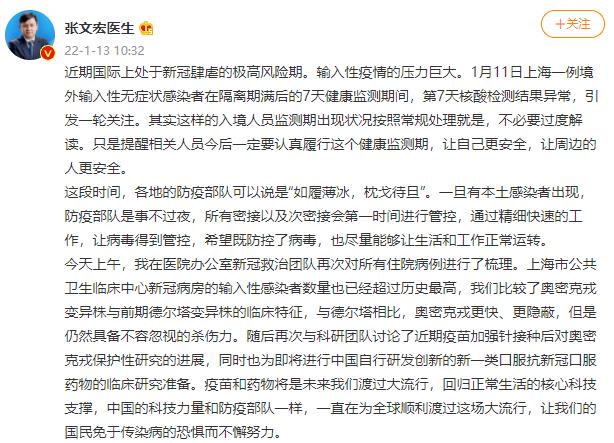 人民網北京1月13日電 (記者喬業瓊)1月13日上午,復旦大學附屬華山醫院感染科主任張文宏在其微博上表示,人類與奧密克戎的搏斗還處于最艱難的時刻。同時也有跡象表明,情況在朝著有利于人類的方向發展。
