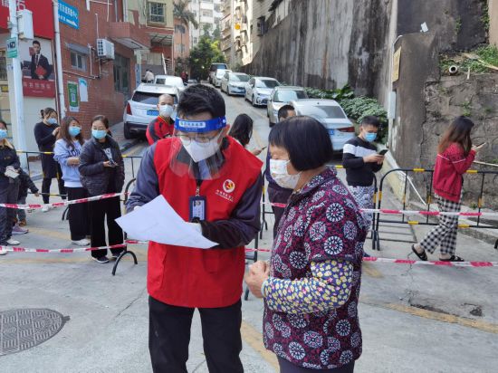 2022年1月8日,在深圳市龍崗區布吉街道布吉社區壹村東心嶺,黨員義工為居民提供服務。新華社發