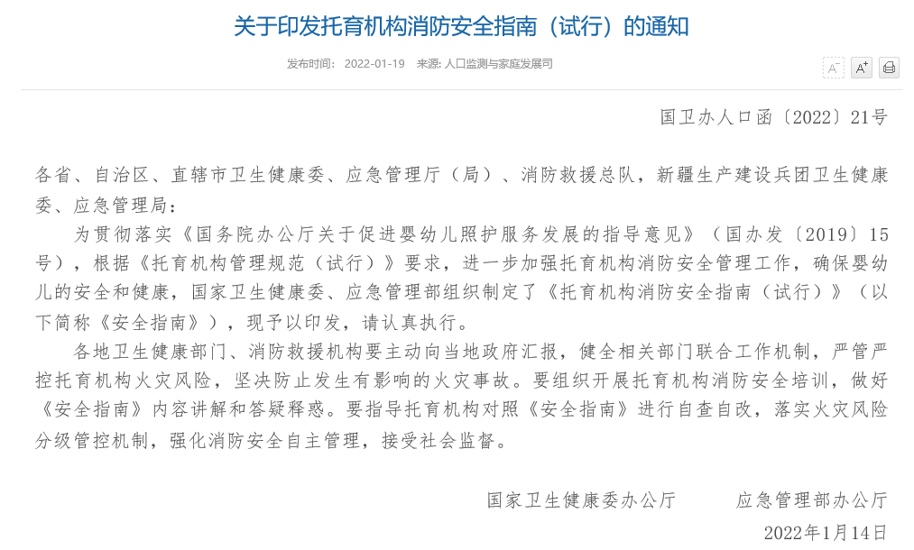 人民網北京1月20日電 (記者張文婷)為進一步加強托育機構消防安全管理工作,確保嬰幼兒的安全和健康,近日,國家衛生健康委、應急管理部組織制定了《托育機構消防安全指南(試行)》(以下簡稱《安全指南》),要求托育機構應安裝24小時可視監控設備或可視監控系統,圖像應能在值班室、所在建筑消防控制室等場所實時顯示,視頻圖像信息保存期限不應少于30天。