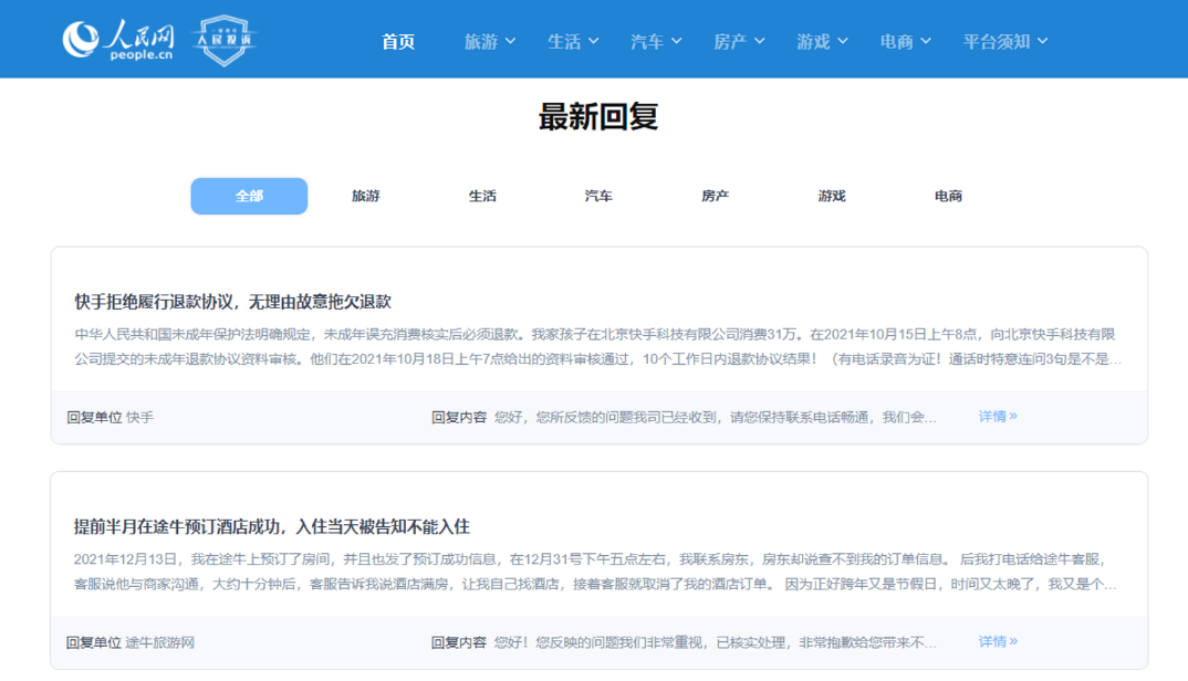 作為人民網重點打造的消費者線上投訴維權服務平臺,“人民投訴”致力于搭建消費者與商家、企業及監管部門之間溝通的橋梁,涵蓋旅游、汽車、房產、家電、3C、生活、游戲、電商等重點消費領域,獨家設置“企業回復”“律師建議”“監管回應”“新聞線索”等多種處理方式,將用戶有效投訴線上轉交給企業、相關部門、專業人士對接,力求讓用戶投訴得到最快答復或解決。同時,對集中、突出的熱點線索及時跟進開展深度調查報道。
