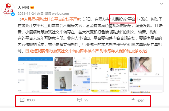2021年推出游戲社交平臺監督報道反響。(人民網微博截圖)