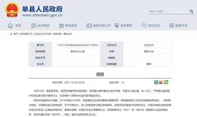 山東菏澤單縣通報“全村腦中風”事件。單縣人民政府官網(wǎng)截圖
