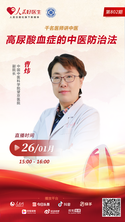 1月26日15:00-16:00,人民日報社旗下新媒體平臺“人民好醫生”與國家中醫藥管理局辦公室聯合推出的“千名醫師講中醫”系列直播將邀請中國中醫科學院望京醫院副院長曹煒做客直播間,為大家詳細講解高尿酸血癥的中醫防治方法。