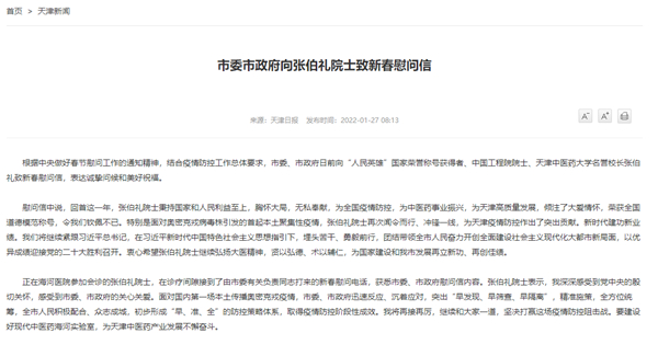 慰問信中說,回首這一年,張伯禮院士秉持國家和人民利益至上,胸懷大局,無私奉獻,為全國疫情防控,為中醫藥事業振興,為天津高質量發展,傾注了大愛情懷,榮獲全國道德模范稱號,令我們欽佩不已。特別是面對奧密克戎病毒株引發的首起本土聚集性疫情,張伯禮院士再次聞令而行、沖鋒一線,為天津疫情防控作出了突出貢獻。新時代建功新業績。