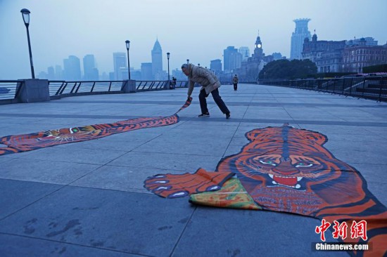 2月1日,市民在上海外灘濱江步道上放風箏,迎接2022年春節。圖為市民正在擺放虎年風箏。 殷立勤 攝