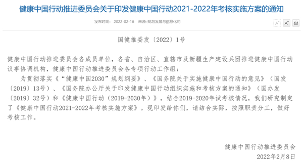 國家衛健委發布健康中國行動2021-2022年考核實施方案 將從五維度進行考核