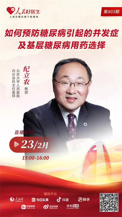2月23日15:00,北京大學人民醫院內分泌科主任醫師紀立農教授將做客“人民好醫生”健康科普直播間,對于糖尿病并發癥等一系列問題進行解答,千萬不要錯過。