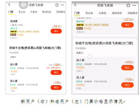 體驗人員分別通過新、老用戶賬號同時在飛豬旅行app上預訂同一日期“宋城千古情(貴賓票)+靈隱飛來峰(大門票)成人票”時,老用戶賬號顯示價格360元,享受飛豬紅包10元,優惠后價格為350元;而新用戶賬號顯示價格355元,不享受任何優惠,新、老用戶賬號顯示價格不同,享受優惠也不同。