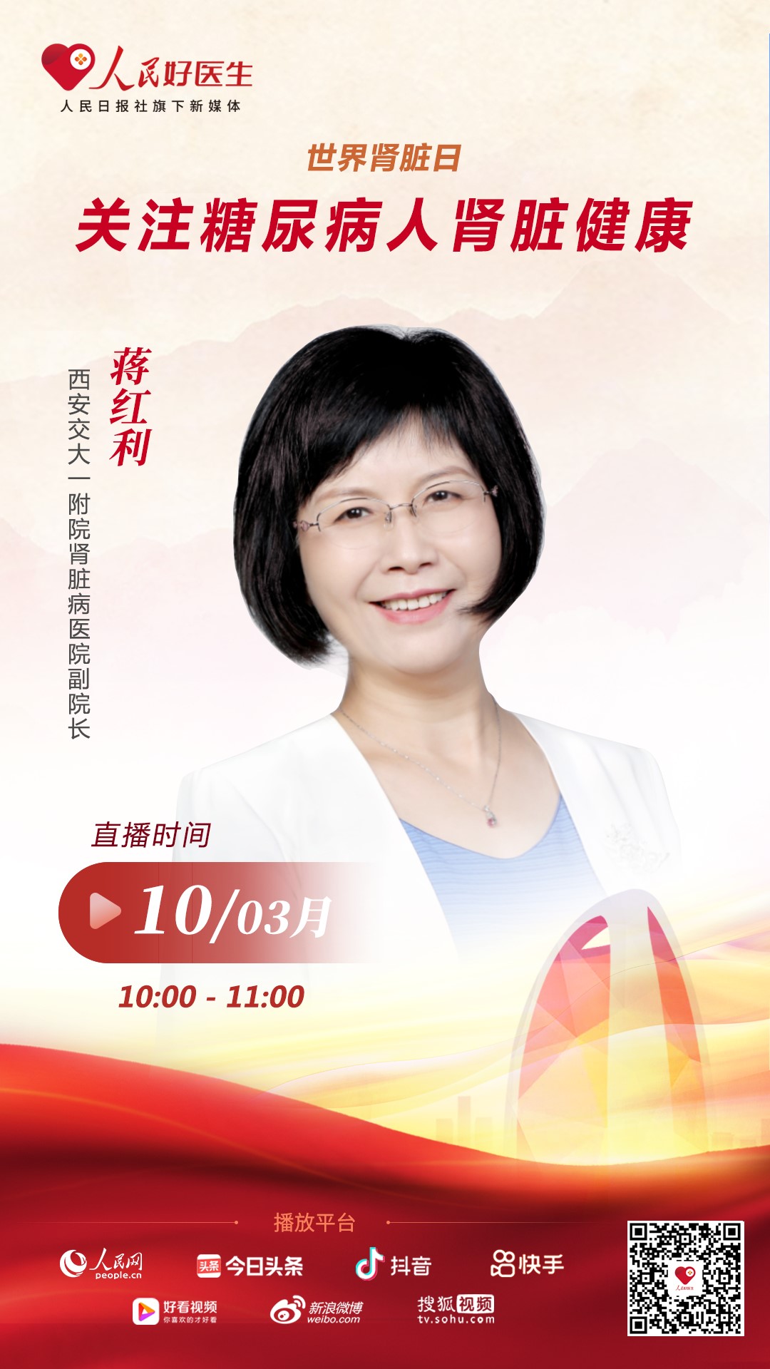 為普及腎臟病知識,3月10日10:00,人民日報社旗下新媒體“人民好醫生”客戶端將邀請西安交大一附院腎臟病醫院副院長蔣紅利做客直播間,就糖尿病人的腎臟健康話題與公眾進行分享,歡迎屆時收看。