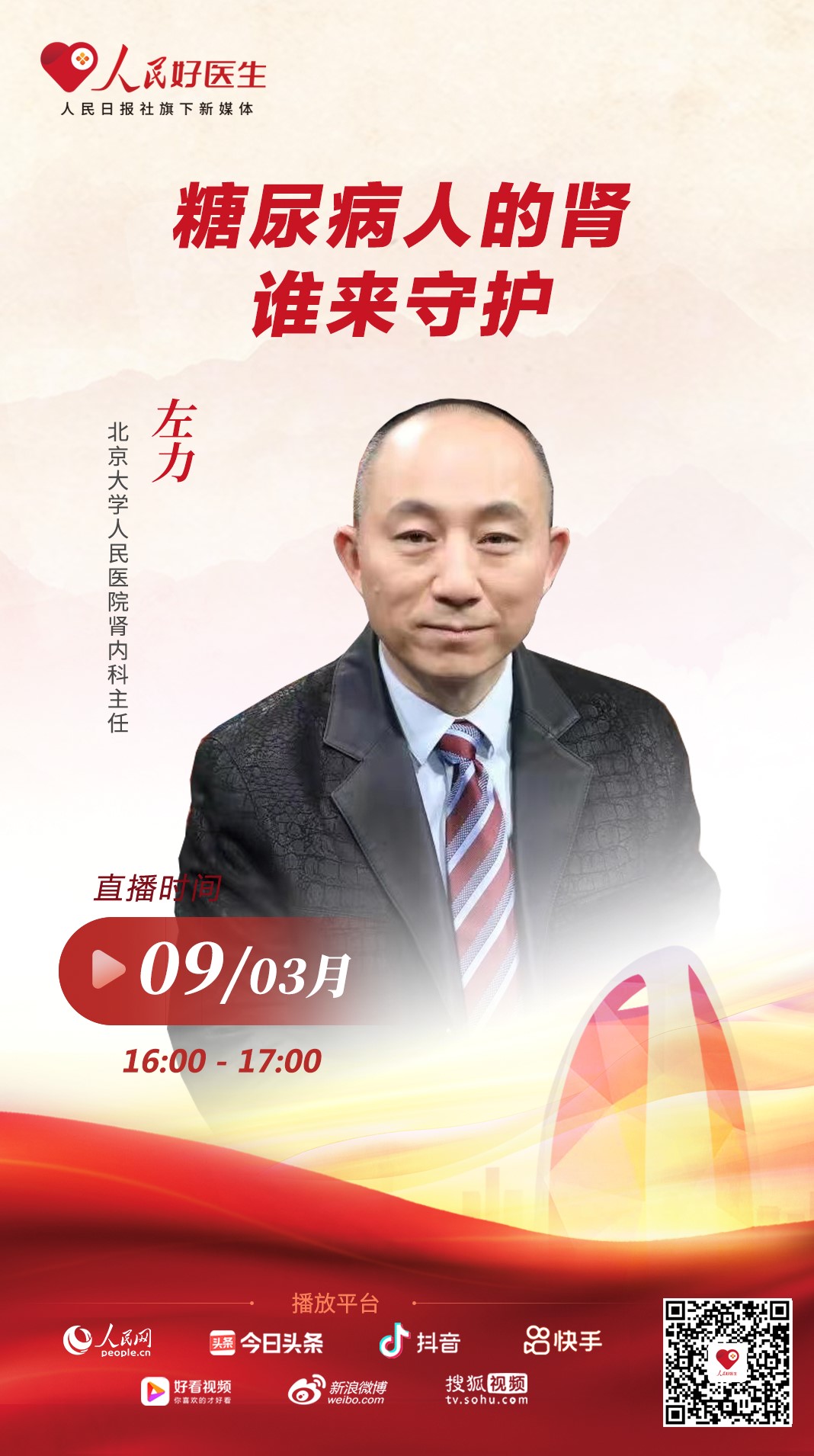 3月9日16:00,北京大學人民醫院腎內科主任左力將做客人民日報社旗下新媒體“人民好醫生”客戶端,聚焦“糖尿病人的腎臟健康”話題,為公眾普及腎臟病相關知識,歡迎屆時收看。
