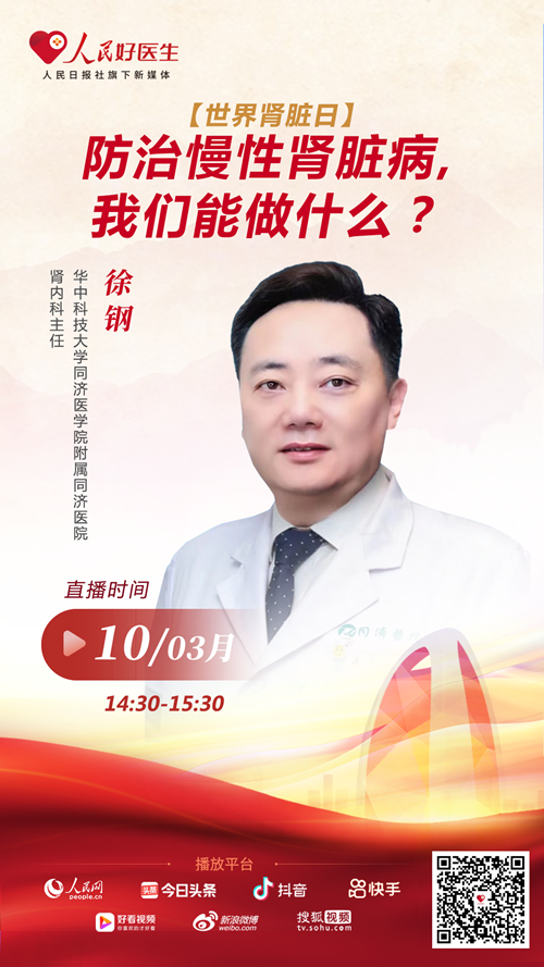 3月10日14:30,華中科技大學同濟醫學院附屬同濟醫院腎內科主任徐鋼將做客人民日報社旗下新媒體平臺“人民好醫生”客戶端直播間,向廣大網友分享腎臟疾病防治相關知識,歡迎屆時收看。