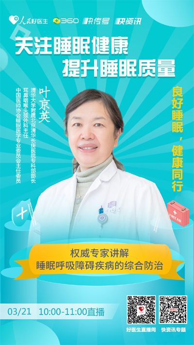 3月21日10:00,清華大學附屬北京清華長庚醫院專科部部長、耳鼻咽喉頭頸外科主任、中國醫師協會睡眠醫學專業委員會主任委員葉京英將做客“人民好醫生”APP直播間,與大家分享睡眠呼吸障礙疾病的綜合防治相關科普知識。歡迎屆時收看。