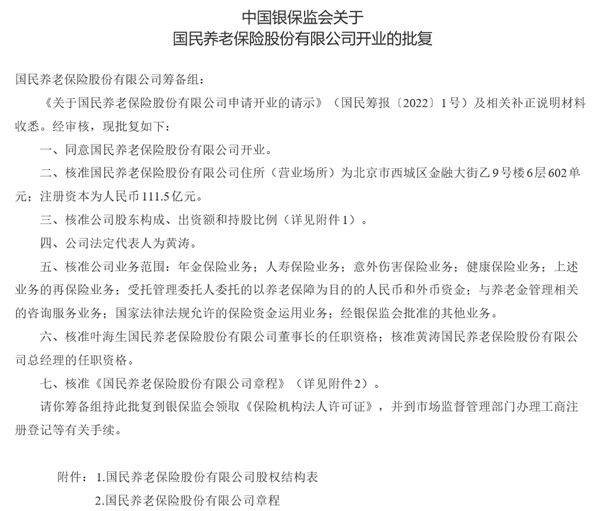 人民網(wǎng)北京3月23日電 (記者張文婷)我國保險業(yè)迎來第10家養(yǎng)老險公司。銀保監(jiān)會22日發(fā)布公告稱,經審核,同意國民養(yǎng)老保險股份有限公司開業(yè),核準葉海生擔任國民養(yǎng)老保險股份有限公司董事長,黃濤擔任國民養(yǎng)老保險股份有限公司總經理。