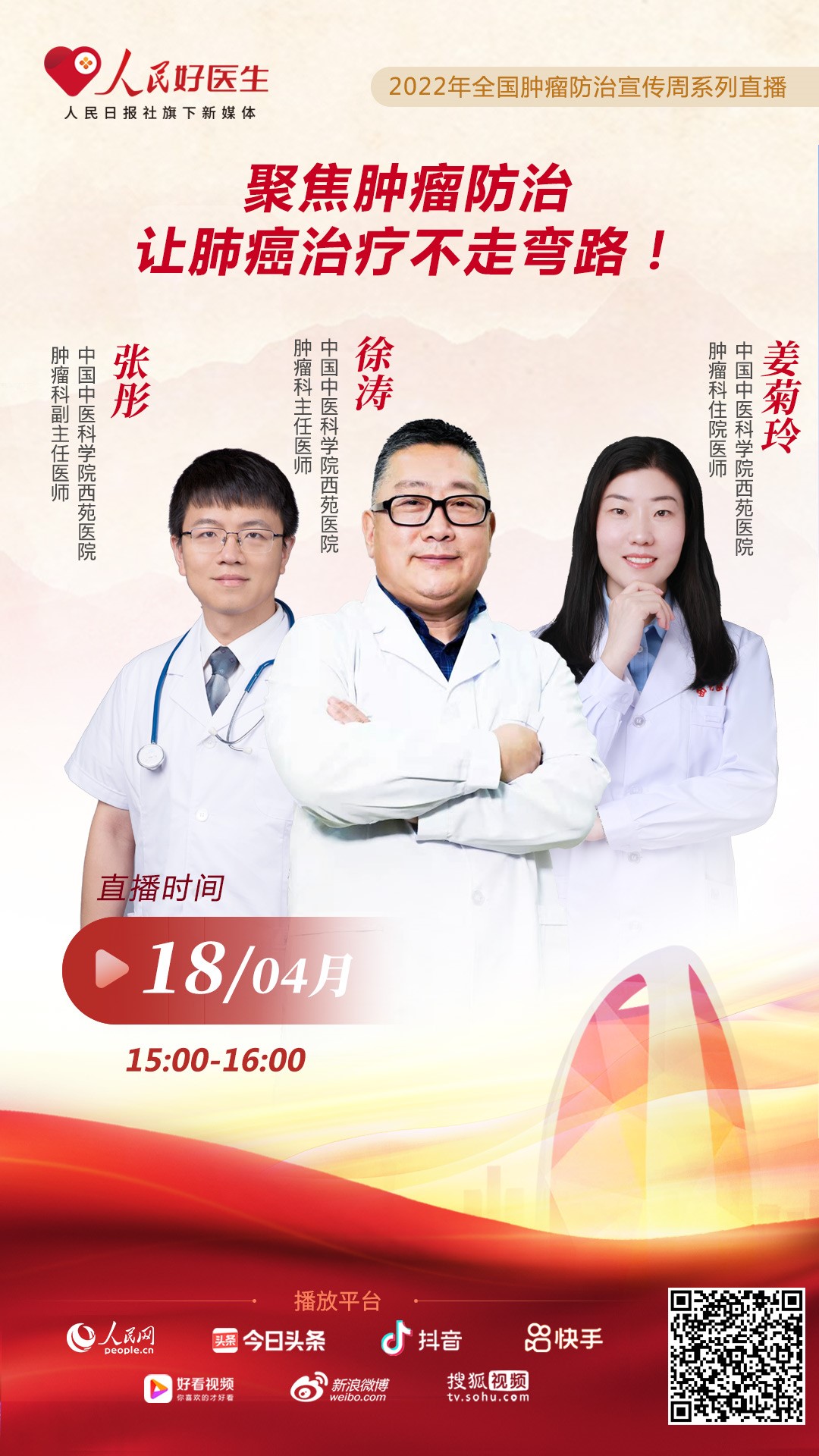 4月18日15:00,中國中醫(yī)科學院西苑醫(yī)院腫瘤科主任醫(yī)師徐濤、中國中醫(yī)科學院西苑醫(yī)院腫瘤科副主任張彤、中國中醫(yī)科學院西苑醫(yī)院腫瘤科住院醫(yī)師姜菊玲將做客“人民好醫(yī)生”客戶端,為公眾普及肺癌防治相關(guān)知識。
