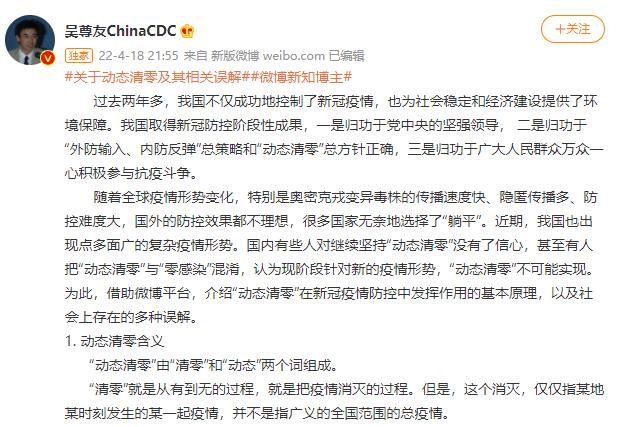 人民網(wǎng)北京4月19日電 (記者喬業(yè)瓊)針對“動態(tài)清零”在新冠疫情防控中發(fā)揮作用的基本原理,以及近期社會上存在的多種誤解,中國疾控中心流行病學(xué)首席專家吳尊友4月18日晚間通過微博個人賬號發(fā)文表示,“動態(tài)清零”強調(diào)的是社會層面感染者清零,不要求疫情所在地沒有感染者。