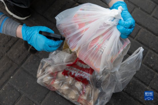 4月17日,在上海黃浦區豫園街道廣福居民區,廣福居委會工作人員對分裝好的物資進行消毒處理。新華社記者 金立旺 攝