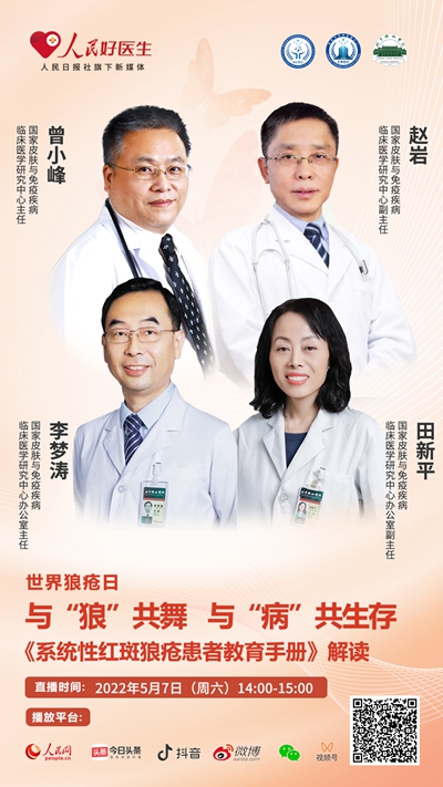 5月7日14:00至15:00,國家皮膚與免疫疾病臨床醫學研究中心主任曾小峰,國家皮膚與免疫疾病臨床醫學研究中心副主任趙巖,國家皮膚與免疫疾病臨床醫學研究中心辦公室主任李夢濤,國家皮膚與免疫疾病臨床醫學研究中心辦公室副主任田新平,將做客“人民好醫生”健康科普直播間,為大家解讀關于系統性紅斑狼瘡的相關內容,歡迎大家收看。