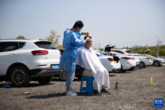 5月4日,在上海浦東北蔡鎮(zhèn)設(shè)立的醫(yī)護(hù)集散點(diǎn),志愿者幫助工作人員理發(fā)。