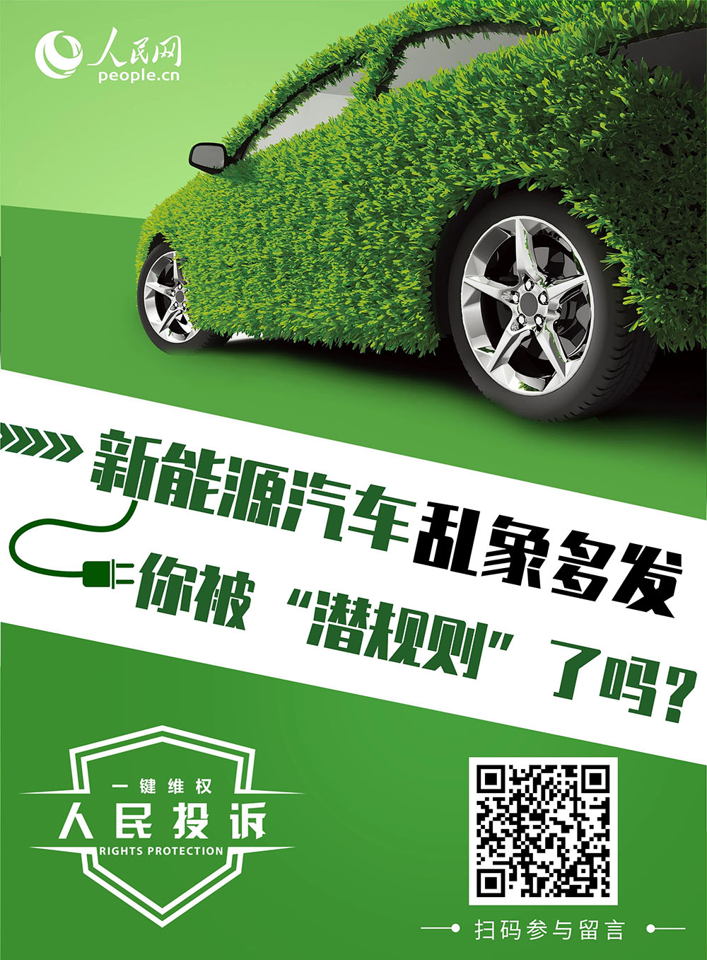 消費者在新能源汽車消費、使用過程中如何合理避坑呢?為助力廣大消費者有效維權,督促廠商、經銷商、4S店、車險機構等相關市場主體規(guī)范經營行為、完善服務保障,推動相關部門對侵權亂象加大監(jiān)管和處罰力度,人民網(wǎng)“人民投訴”平臺即日起征集相關維權線索,如果您遭遇此類權益侵害,如果您了解相關領域某些欺詐行為中不為人知的陷阱、黑幕,歡迎您掃碼投訴、曝光。