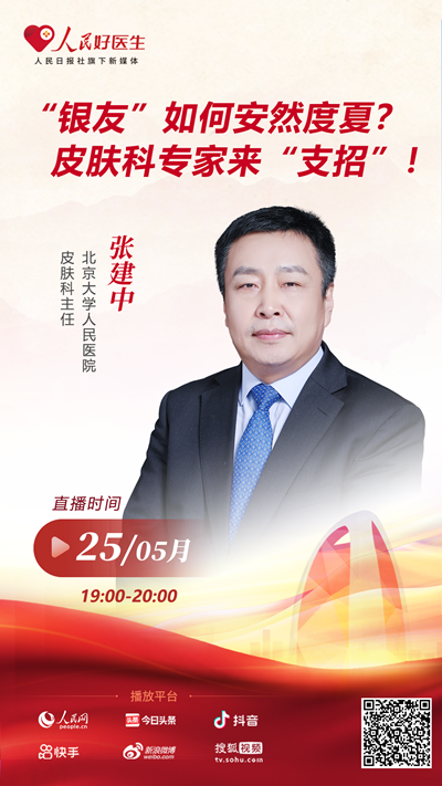 5月25日19:00至20:00,“人民好醫生”客戶端將邀請到北京大學人民醫院皮膚科主任張建中做客演播室,共同就“銀屑病患者安然度夏”這一話題進行講解,希望通過專家的科普宣講,讓更多的患者提升對銀屑病的正確認知,同時了解包括生物制劑在內的標準化治療手段,從而幫助患者保持病情穩定、減少復發。