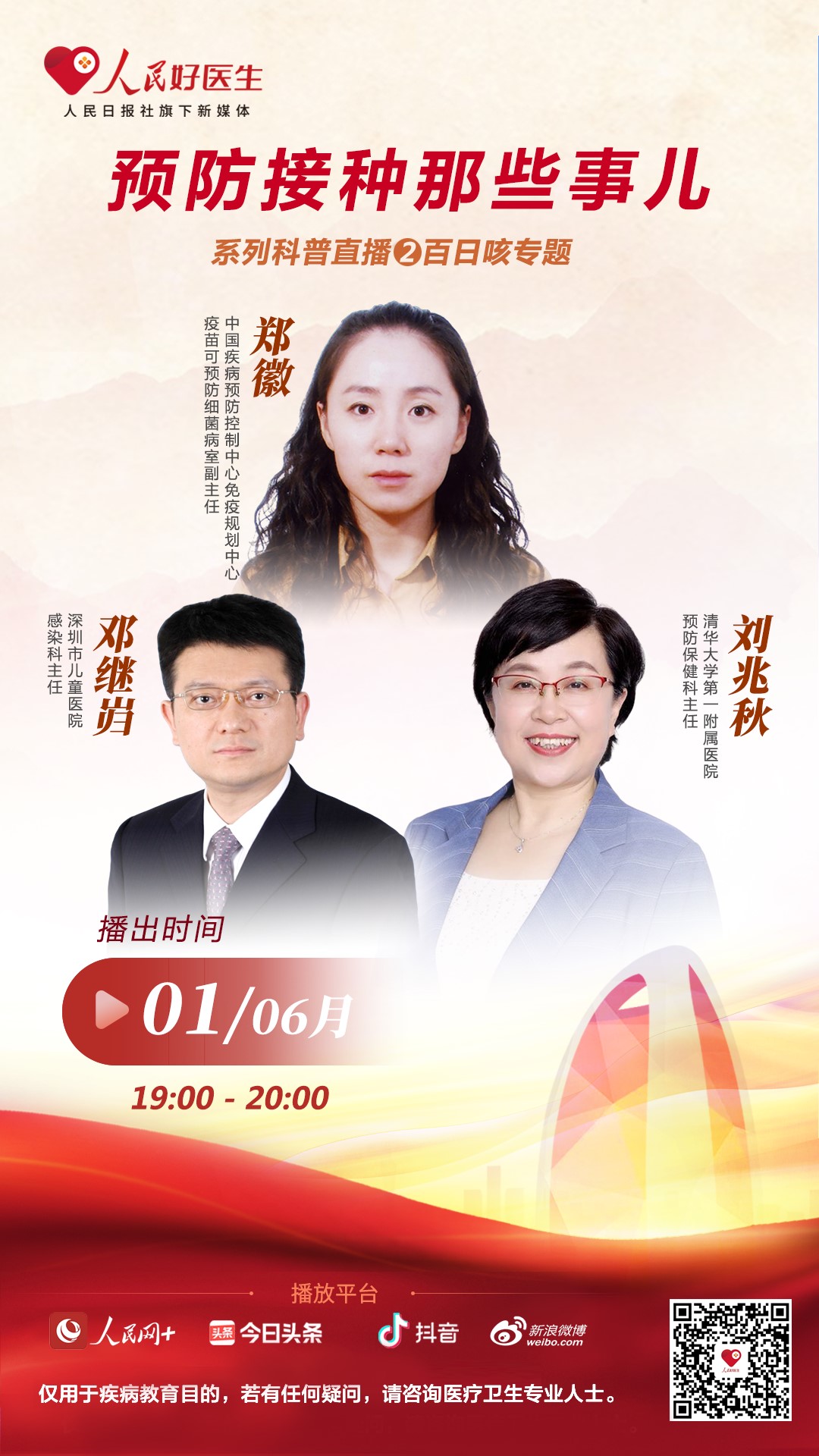 6月1日19:00,中國疾病預防控制中心免疫規劃中心疫苗可預防細菌病室副主任鄭徽、深圳市兒童醫院感染科主任鄧繼巋、清華大學第一附屬醫院預防保健科主任劉兆秋將做客“人民好醫生”客戶端,為公眾普及百日咳相關知識。