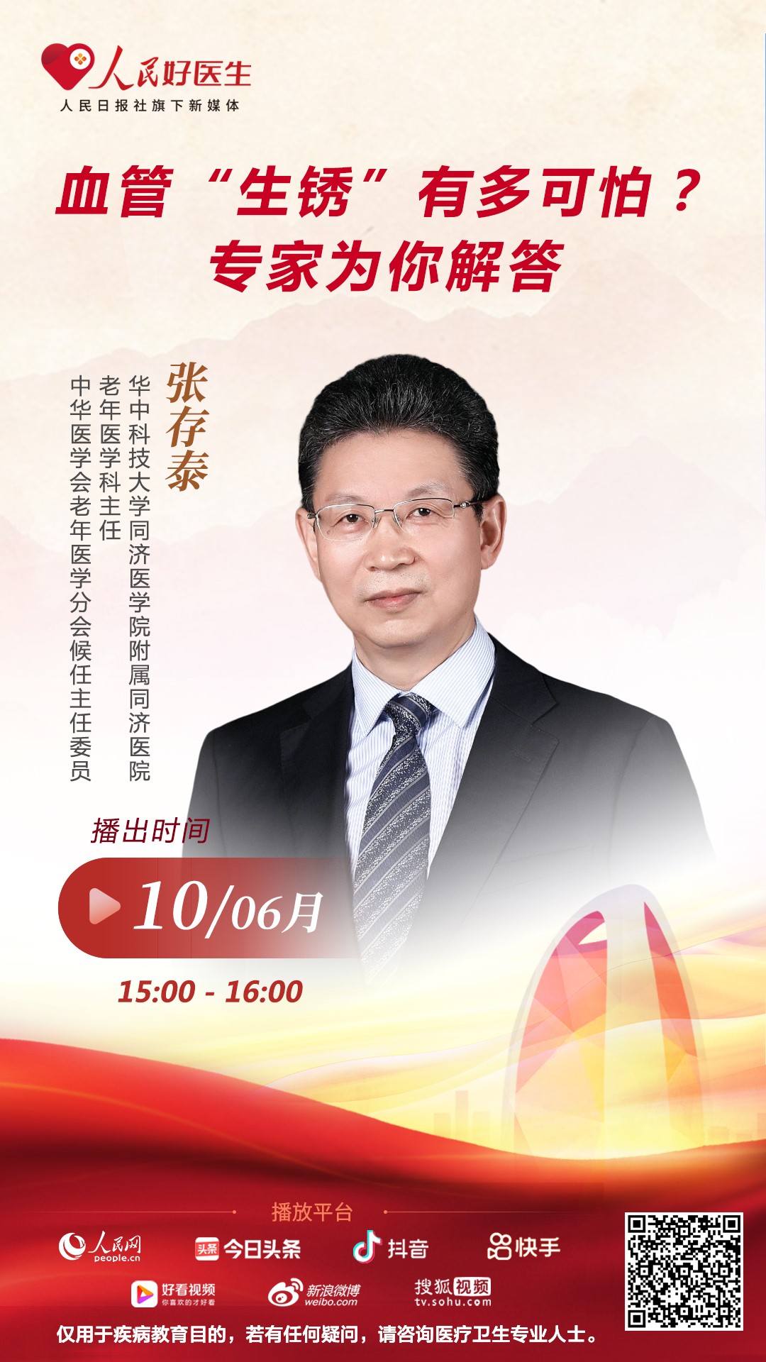 心腦血管疾病已經成為我國目前主要致死病因,無論是冠心病、心肌梗死或是腦梗死,其本質上都屬于血管疾病。血管健康,決定人的健康。血管“生銹”到底有多可怕?該如何守護血管健康?6月10日15:00,華中科技大學同濟醫學院附屬同濟醫院老年醫學科主任、中華醫學會老年醫學分會候任主任委員、中國醫師協會老年科醫師分會副會長張存泰將做客“人民好醫生”客戶端直播間,和大家分享血管老化的相關知識,教大家破譯血管健康密碼。