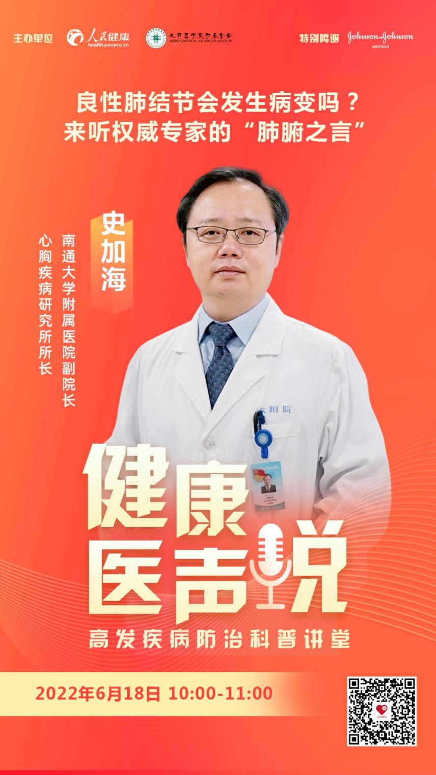 6月18日10:00,南通大學附屬醫院副院長、心胸疾病研究所所長史加海將作為首期嘉賓做客“人民好醫生”客戶端直播間,就肺結節相關問題與網友進行分享。