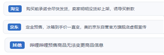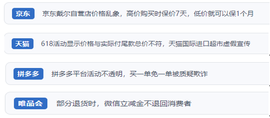 聚焦電商領域,“人民投訴”用戶投訴多聚焦在:平臺自營、旗艦店商品質量難保障;商品以次充好、貨不對板、少發漏發、不履行贈品承諾;保價期間不補差價,價保期限設置藏貓膩;平臺店鋪活動規則被質疑真引流、假優惠等方面。家電數碼領域的突出問題是:智能家電產品質量不穩定,體驗效果不佳,標準不明確,退貨退款難;產品使用中出現故障,檢測信息不透明、售后過程不暢;商家以用戶已使用等為由拒絕更換商品等。