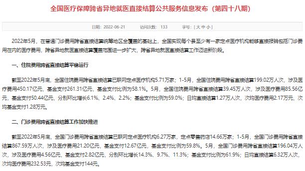 聚焦1.25億跨省流動人口的就醫(yī)結(jié)算需求,深入推進(jìn)醫(yī)保領(lǐng)域“放管服”改革,2021年以來,國家醫(yī)保局會同有關(guān)部門鞏固拓展住院費(fèi)用跨省直接結(jié)算成果,全面推動門診費(fèi)用跨省直接結(jié)算工作。截至2022年5月底,全國住院費(fèi)用跨省直接結(jié)算已聯(lián)網(wǎng)定點醫(yī)療機(jī)構(gòu)5.71萬家;1-5月,全國住院費(fèi)用跨省直接結(jié)算199.02萬人次,涉及醫(yī)療費(fèi)用450.17億元,基金支付261.31億元,基金支付比例為58.1%。截至2022年5月底,全國門診費(fèi)用跨省直接結(jié)算已聯(lián)網(wǎng)定點醫(yī)療機(jī)構(gòu)6.27萬家,定點零售藥店14.66萬家;1-5月,全國門診費(fèi)用跨省直接結(jié)算867.59萬人次,涉及醫(yī)療費(fèi)用21.20億元,基金支付12.67億元,基金支付比例為59.8%。