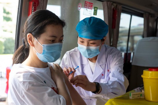 5月20日,在鄭州市金水區(qū)花園路與金水路交叉口,市民在新冠疫苗接種車上接種疫苗。新華社記者 徐嘉懿 攝