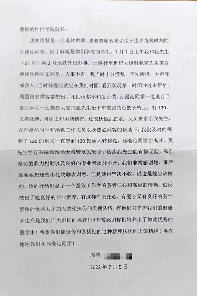 7月19日,上海中醫(yī)藥大學(xué)官微分享了一則暖心新聞,該學(xué)校2022級博士生孫漫沁同學(xué)救人于生命危急時(shí)刻,被稱贊是一名有愛心又有良好醫(yī)學(xué)素養(yǎng)的優(yōu)秀人才!