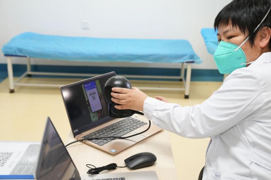 5月23日,在北京市豐臺區盧溝橋社區衛生服務中心,醫務工作者通過視頻連線的方式為預約上門治療的患者掃描電子醫保卡。新華社記者 鞠煥宗 攝