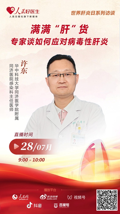 7月28日9:00,華中科技大學同濟醫(yī)學院附屬同濟醫(yī)院感染科主任醫(yī)師許東將做客“人民好醫(yī)生”客戶端直播間,向廣大網(wǎng)友分享病毒性肝炎的相關(guān)知識,歡迎屆時收看。