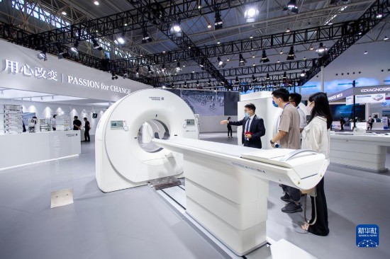 8月5日,在2022年世界大健康博覽會上,觀眾在展廳了解PET-CT系統。