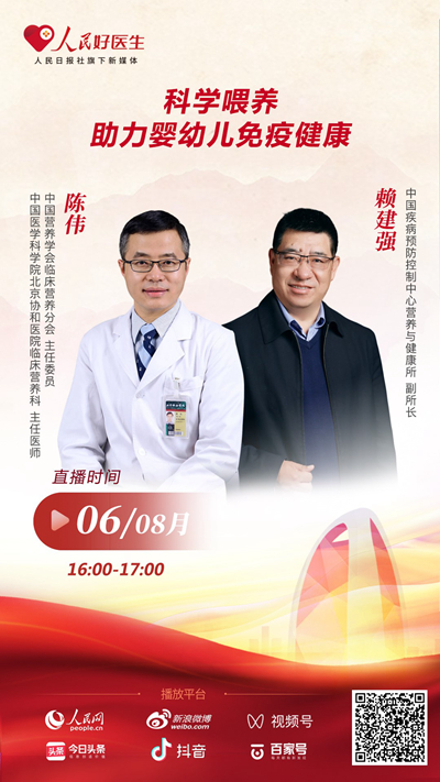8月6日16:00至17:00,中國營養(yǎng)學會臨床營養(yǎng)分會主任委員、中國醫(yī)學科學院北京協(xié)和醫(yī)院臨床營養(yǎng)科主任醫(yī)師陳偉,中國疾病預防控制中心營養(yǎng)與健康所副所長賴建強將做客“人民好醫(yī)生”直播間,和網(wǎng)友們分享寶寶科學喂養(yǎng)的相關內(nèi)容,歡迎收看。