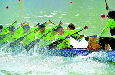 龍舟隊(duì)在湖北宣恩縣貢水河上參加龍舟比賽。 新華社發(fā)