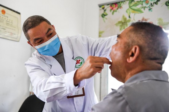 2021年11月3日,在廣西崇左大新縣下雷鎮仁愛村,鄉村醫生趙建柏為村民檢查口腔。新華社記者 曹祎銘 攝