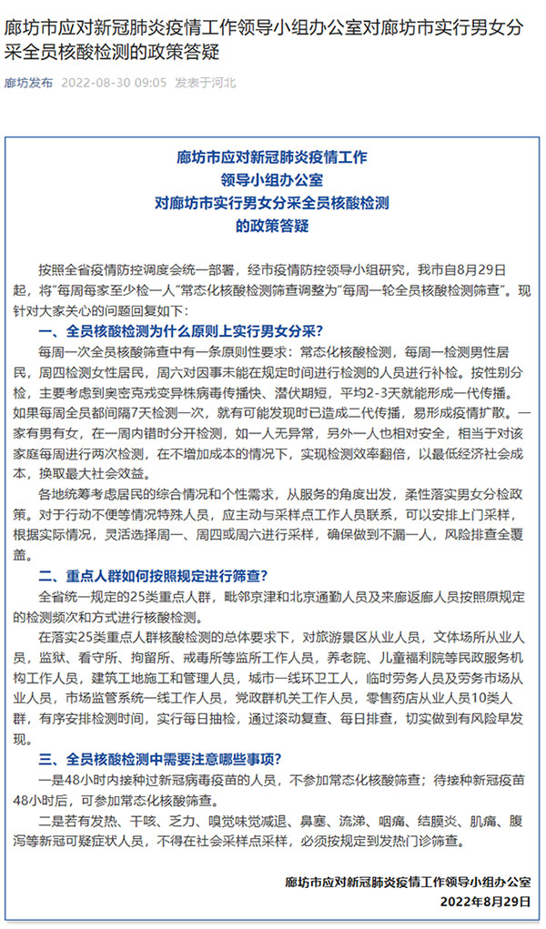 又一地實行全員核酸男女分采 廊坊官方發布政策答疑