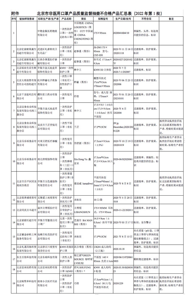 人民網(wǎng)北京9月5日電 (記者孫紅麗)近日,北京市市場監(jiān)督管理局公布的北京市非醫(yī)用口罩產(chǎn)品質(zhì)量監(jiān)督抽查結(jié)果(2022年第1批)顯示,標(biāo)稱商標(biāo)為超事通(圖形)、林中王、梓濠(圖形)、仟倩等19組批產(chǎn)品不合格,存在的主要質(zhì)量問題是過濾效率、防護(hù)效果等項目不符合標(biāo)準(zhǔn)要求,產(chǎn)品對顆粒物的濾除能力低,防護(hù)效果差。