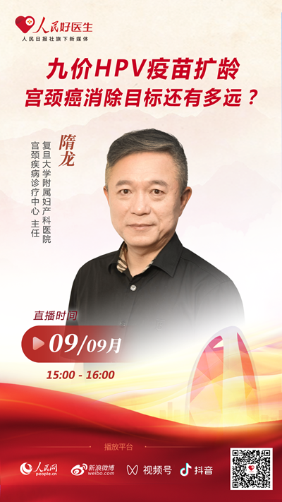 9月9日15:00至16:00,復旦大學附屬婦產科醫院宮頸疾病診療中心主任隋龍將做客“人民好醫生”客戶端直播間,就宮頸癌和九價HPV疫苗的相關知識與網友進行分享,歡迎屆時收看。