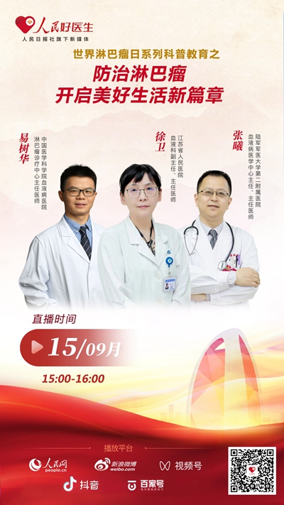 9月15日15:00-16:00,人民好醫生客戶端將邀請江蘇省人民醫院血液科副主任、主任醫師徐衛,陸軍軍醫大學第二附屬醫院血液病醫學中心主任、主任醫師張曦,中國醫學科學院血液病醫院淋巴瘤診療中心主任醫師易樹華共同做客演播室,與網友們一起聊一聊有關淋巴瘤的話題,解答上述疑問,歡迎收看。