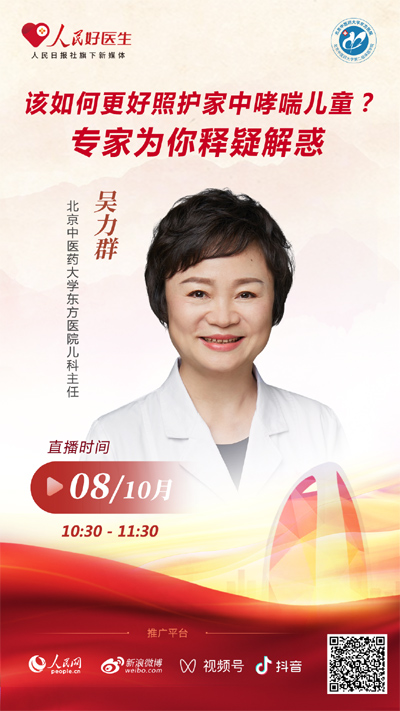 家有哮喘患兒的父母該如何更好地做好家庭照護?10月8日10:30,北京中醫藥大學東方醫院兒科主任、兒科教研室主任吳力群將做客“人民好醫生”客戶端直播間,向廣大網友分享兒童哮喘相關知識。